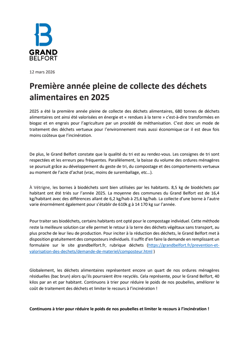 - entrée parking de la mairie Pour les gros cartons ou gros emballages, merci de vous rendre à la déchetterie En cas d'oubli de collecte de votre poubelle, merci de contacter le service des déchets de Grand Belfort au 03 84 90 11 71 Pour les encombrants: Déchetterie de Sermamagny, sur la desserte du pays-sous-vosgien (RD5) ouverte aux horaires suivants : L’été (du 15 avril au 14 octobre) L’hiver (du 15 octobre au 14 avril) Munissez-vous de votre carte de déchèterie. Pour les déchets verts : - La taille des haies est recommandée d'août à mars (d'avril à juillet, cette taille est déconseillée afin de préserver la nidification des oiseaux) Pour voir la liste complète des déchets acceptés : Téléchargez le dépliant des déchèteries Pour en savoir plus, retrouvez toutes les informations sur le site du Grand Belfort : |